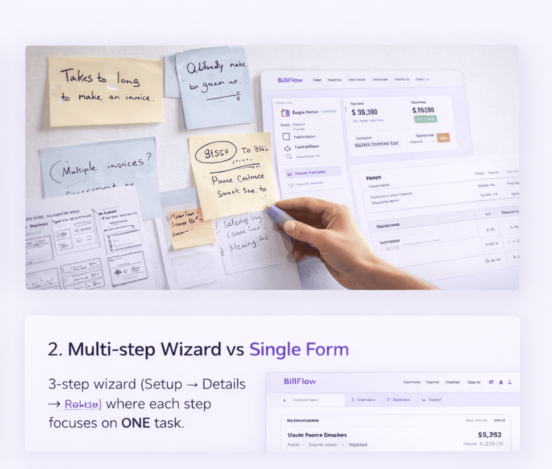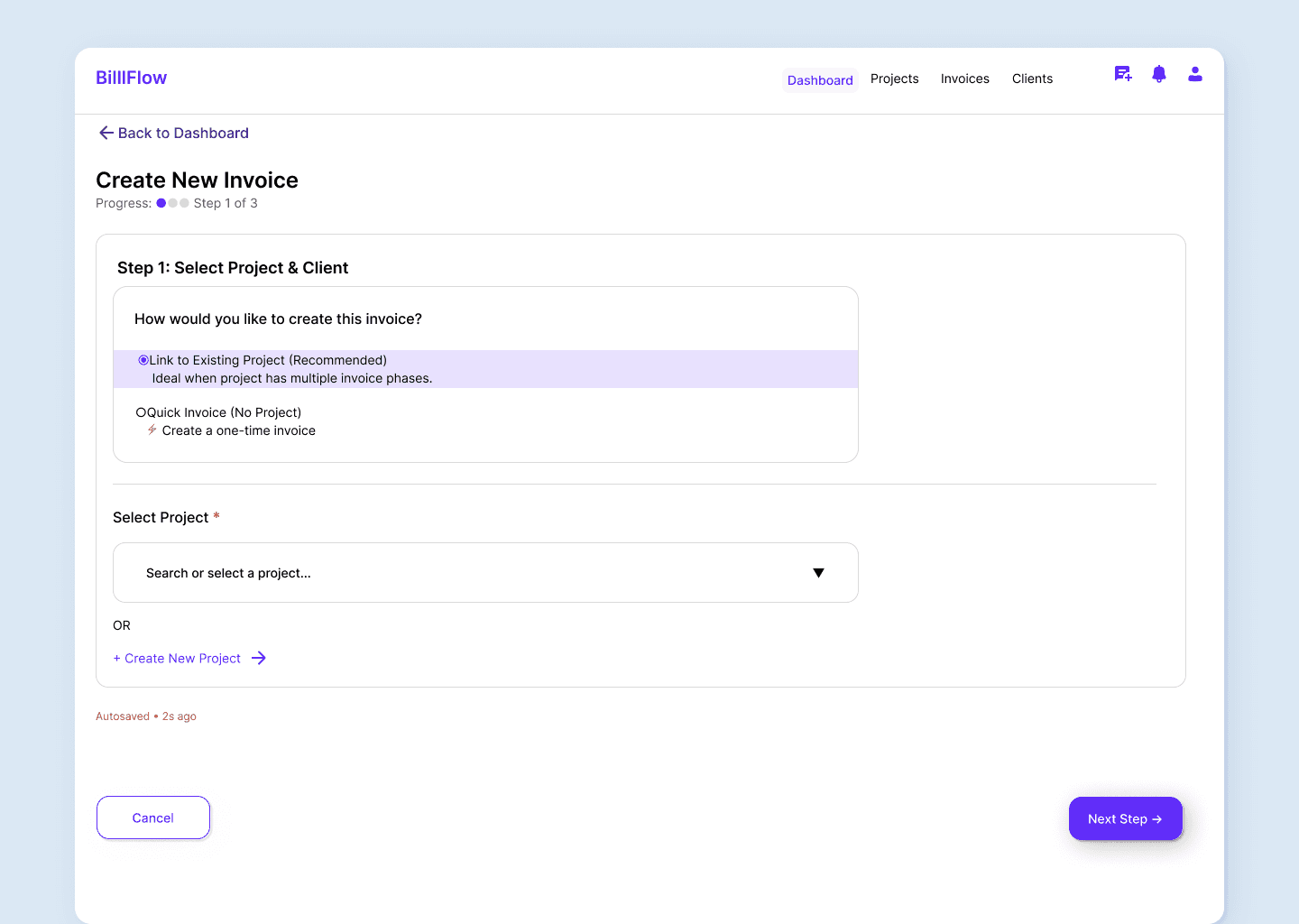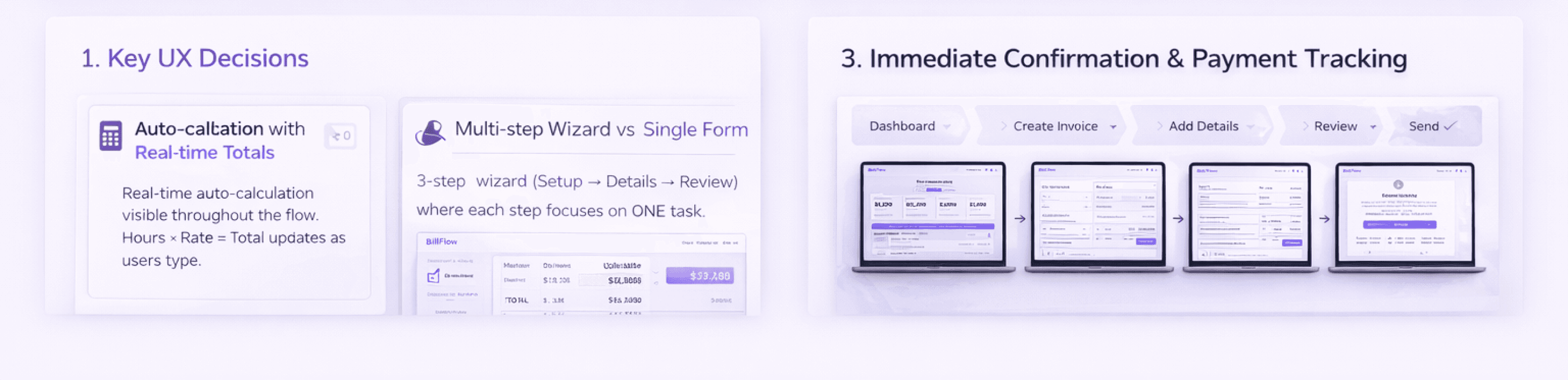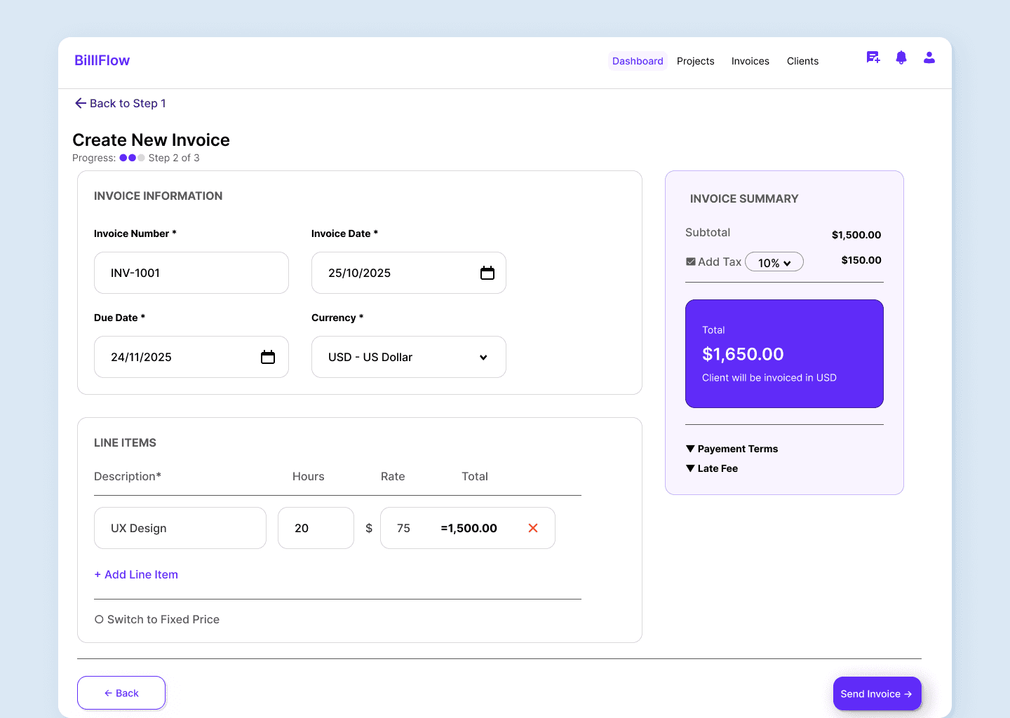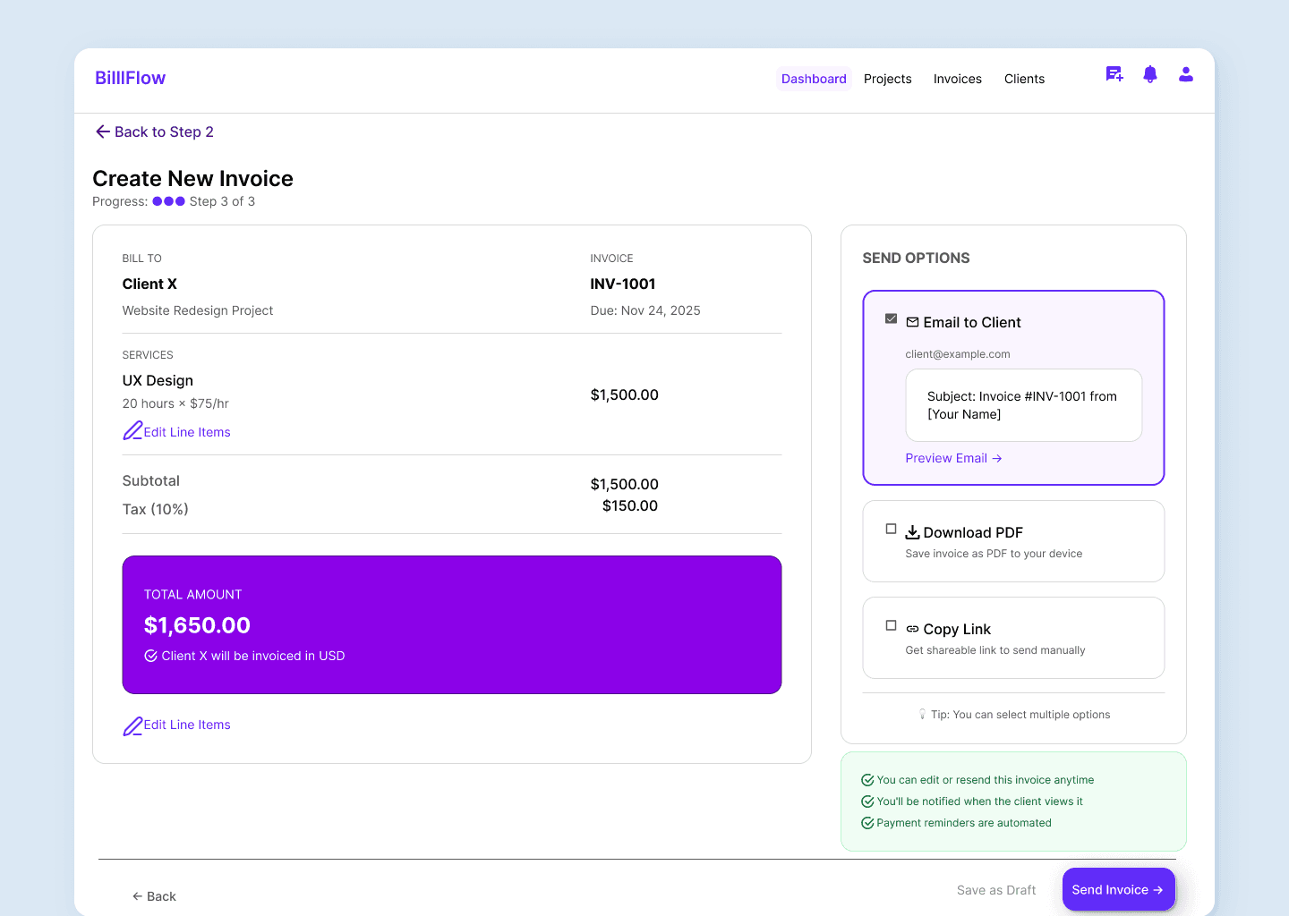 Support both quick one-off invoices and milestone-based projects. Smart defaults reduce effort for repeat clients, while the stepped approach prevents cognitive overload.