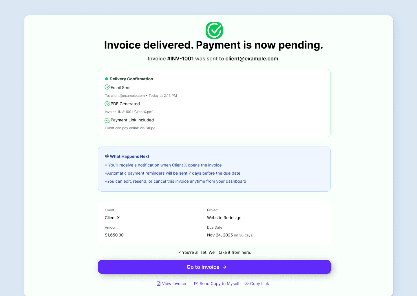 After sending, users see exactly what happened and what to do next. Multiple exit paths allow seamless continuation of workflow without dead ends..